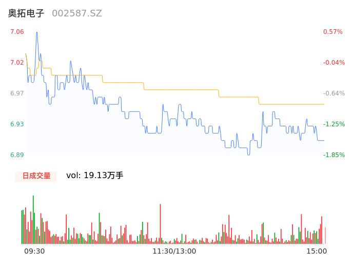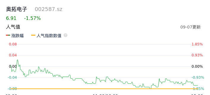 09月07日,奥拓电子收报6.91,股价涨幅-1.57%,成交金额1.33亿元,换手率3.73%。