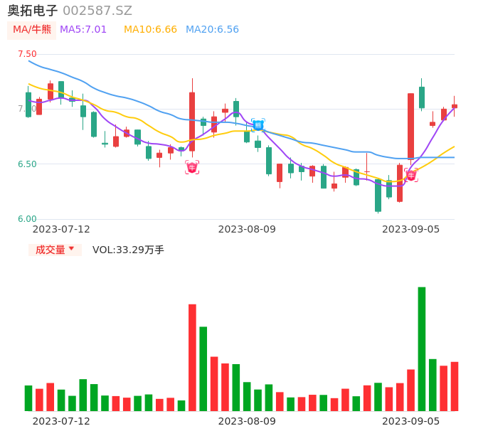 09月05日,奥拓电子收报7.04,股价涨幅0.57%,成交金额2.34亿元,换手率6.48%。