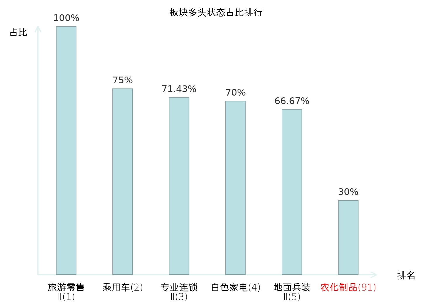 全市场所有行业板块中主力多头状态占比排名中,旅游零售Ⅱ板块位居第一。焦炭Ⅱ板块名次提升最快,较昨日上升105位。