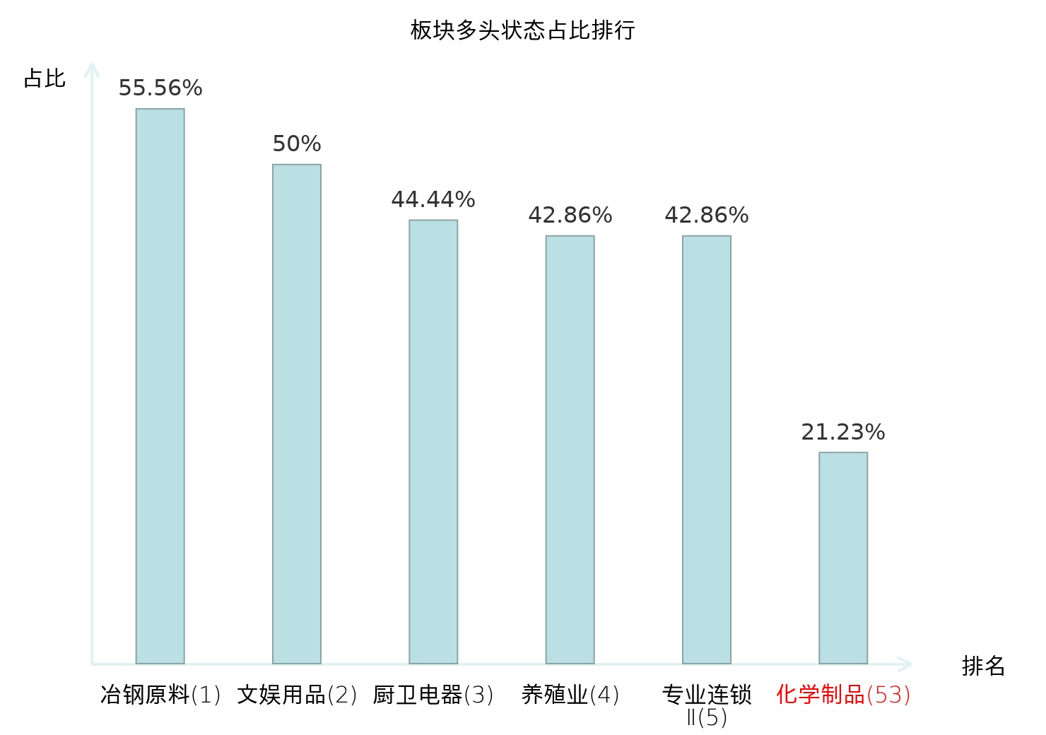 全市场所有行业板块中主力多头状态占比排名中,冶钢原料板块位居第一。能源金属板块名次提升最快,较昨日上升48位。