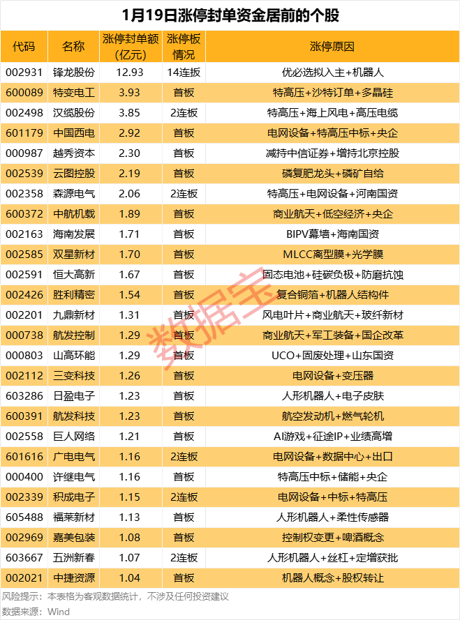 以封单金额计算,锋龙股份、特变电工、汉缆股份等涨停板封单资金居前,分别有12.93亿元、3.93亿元、3.85亿元。