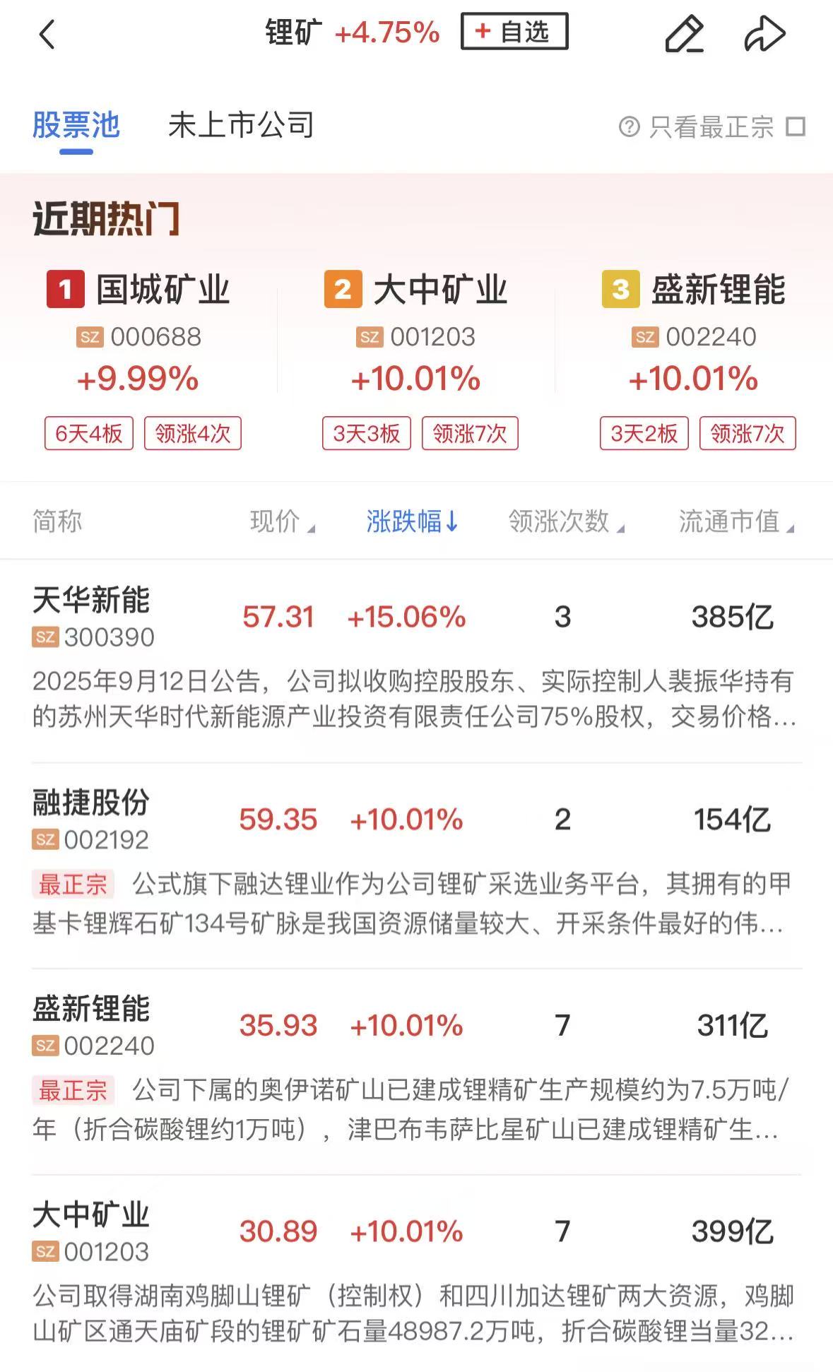 板块上,锂矿板块涨幅居前,融捷股份大中矿业盛新锂能涨停,天华新能天齐锂业雅化集团永兴材料等涨幅居前。