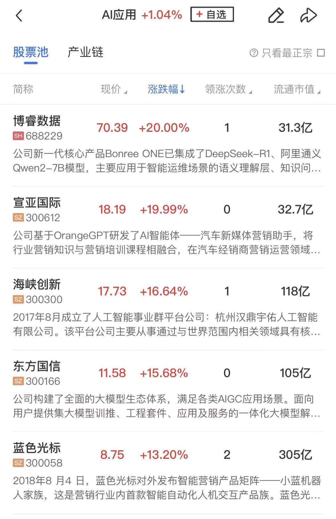 AI应用概念快速走强,三六零垒知集团华胜天成涨停,蓝色光标东方国信苏州科达易点天下涨幅居前。
