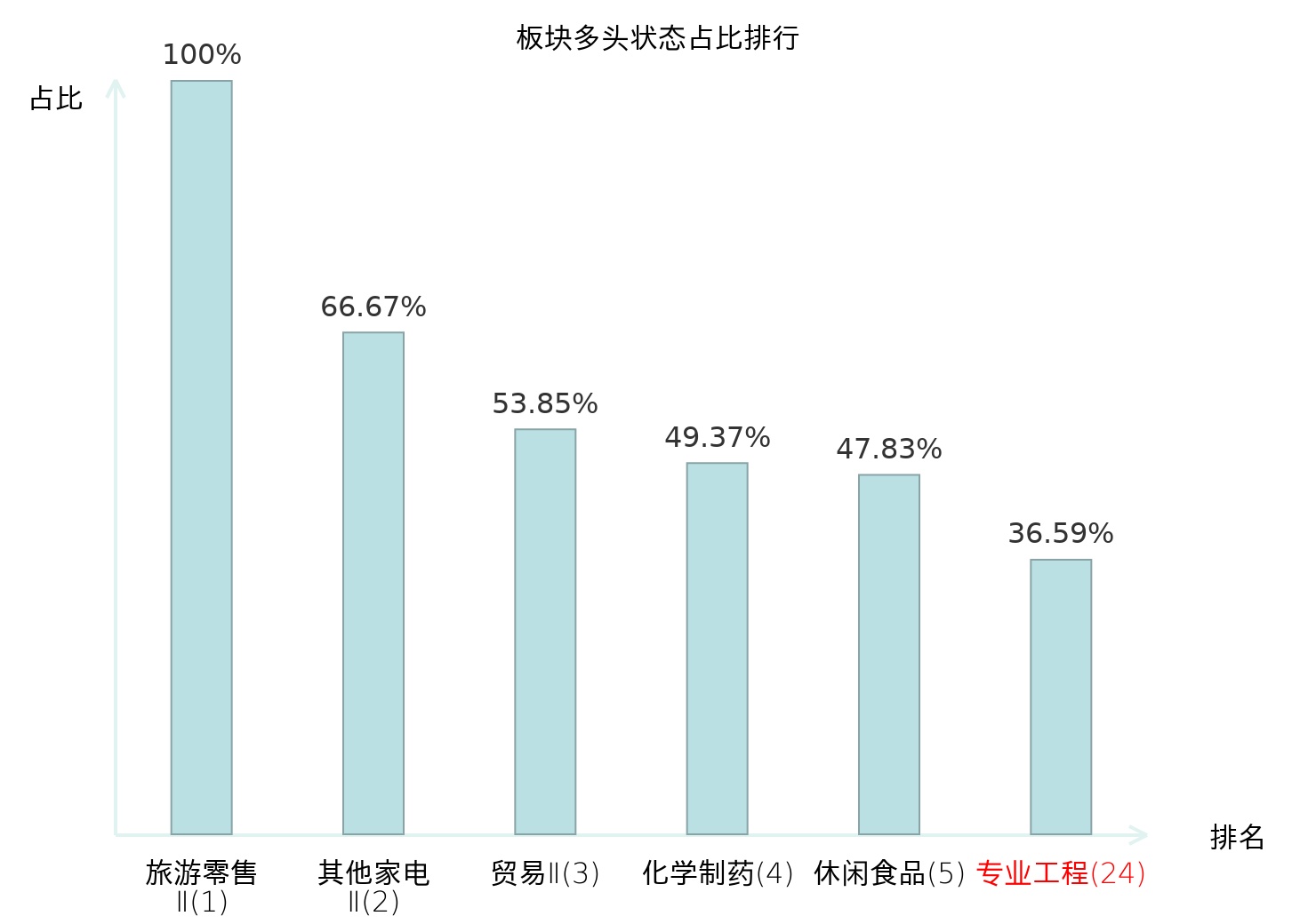 全市场所有行业板块中主力多头状态占比排名中,旅游零售Ⅱ板块位居第一。互联网电商板块名次提升最快,较昨日上升55位。