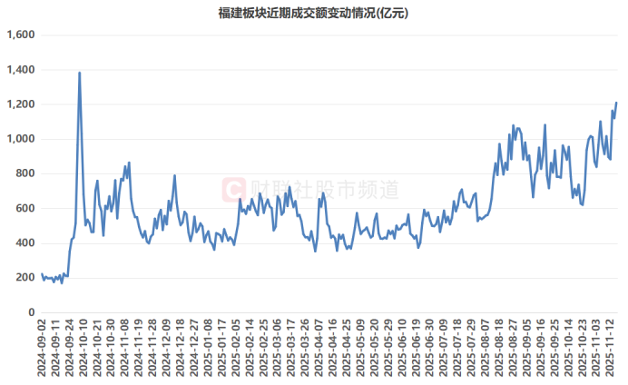 受产业政策利好叠加资金共振影响,福建板块近期成为市场关注焦点。从量能数据上看,其板块今日成交总额1209.32亿元,较上一交易日继续放量近90亿元,同时创历史第二高峰值纪录,仅低于去年10月8日(1381.93亿元)。个股方面,今日共有10只福建股成交额创年内新高,其中,东百集团、三木集团2股今日成交额录得历史天量。