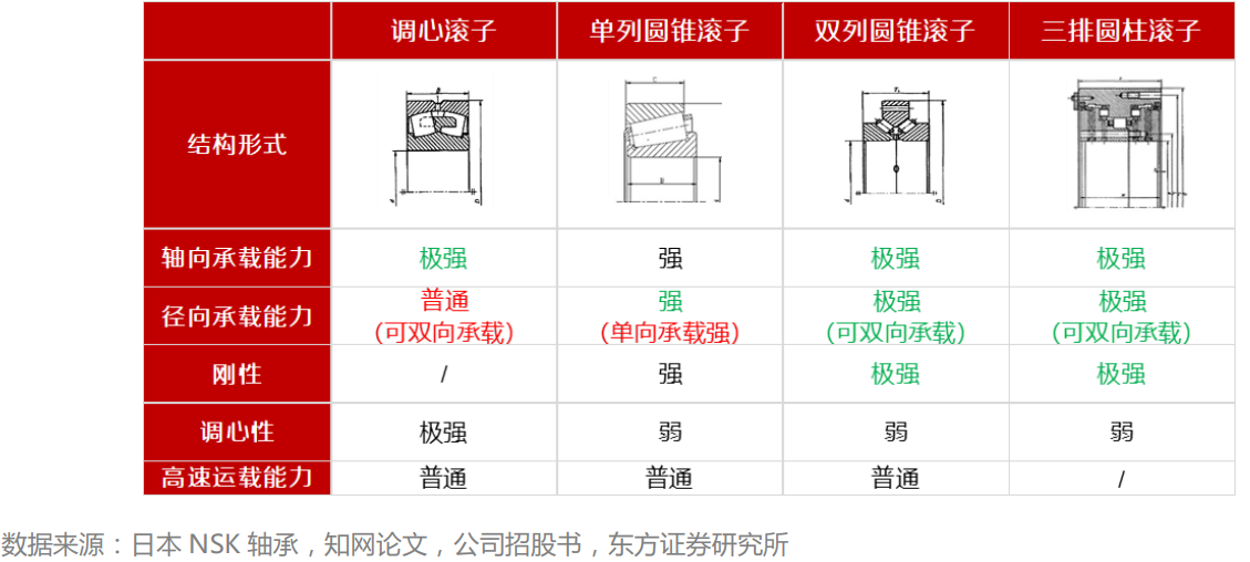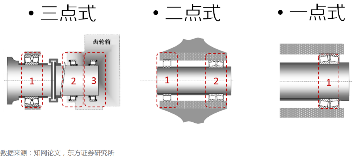 常用类型可分为调心滚子轴承,单列圆锥滚子轴承,双列圆锥滚子轴承与三排圆柱滚子轴承,未来单列圆锥有望成为新的主流趋势;依据风机主轴支撑方式分类,可分为三点式支撑、两点式支撑和一点式支撑。