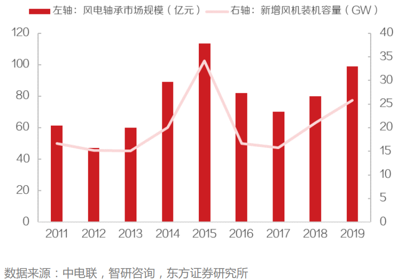 图:历年中国风电新增装机容量与风电轴承市场规模 |