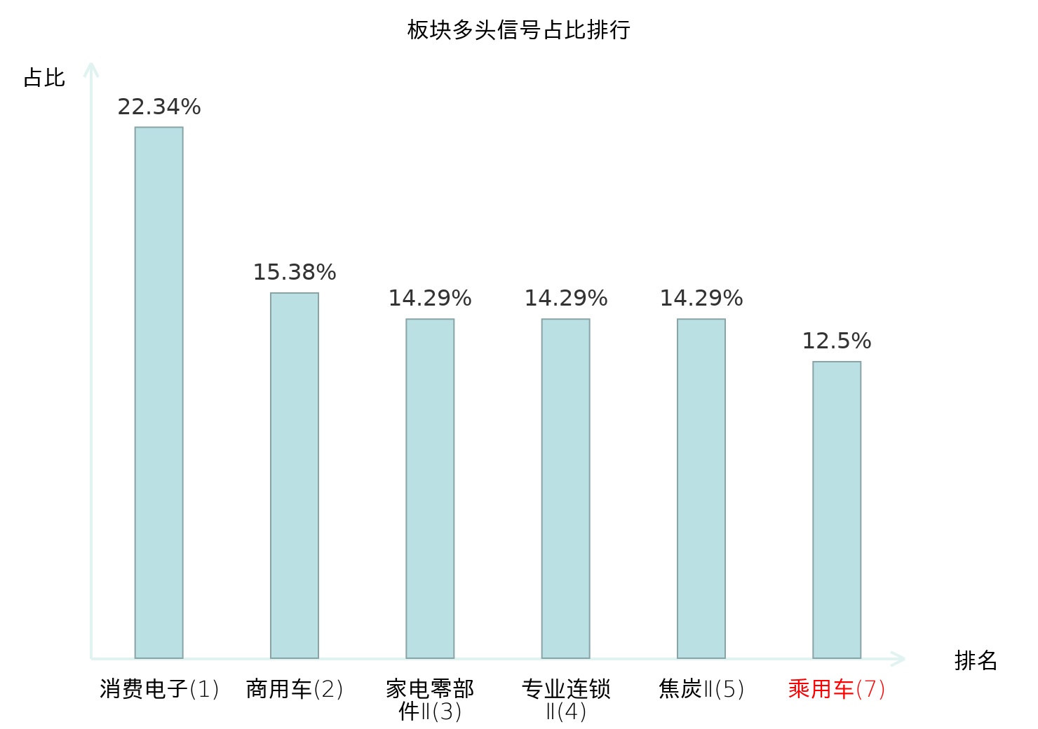 全市场所有行业板块中主力多头信号占比排名中,消费电子板块位居第一。专业连锁Ⅱ板块名次提升最快,较昨日上升117位。