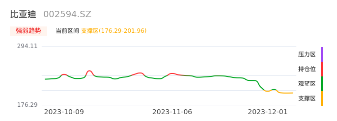 我们来看一下该股的九方特色指标强弱趋势的情况:比亚迪近日从观望区进入支撑区。股价出现一波快速下跌行情,目前下跌动能仍未衰竭。建议继续谨慎观望。注意今日下方支撑位:176.29元,如有效跌破将可能出现新一轮下跌