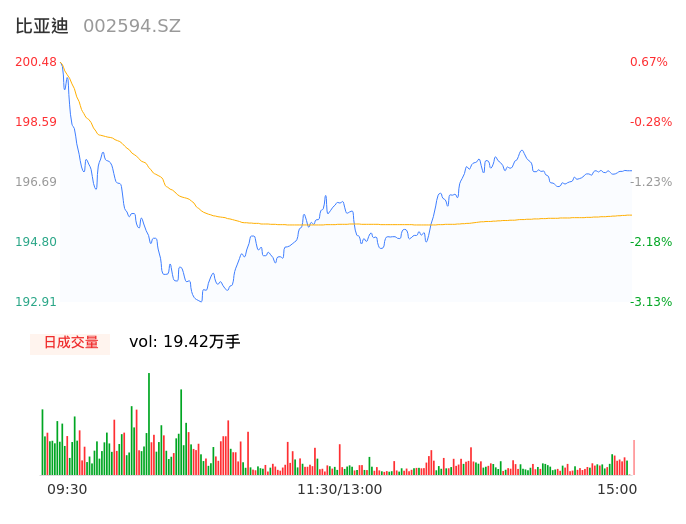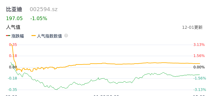12月01日,比亚迪收报197.05,股价涨幅-1.05%,成交金额37.99亿元,换手率1.67%。
