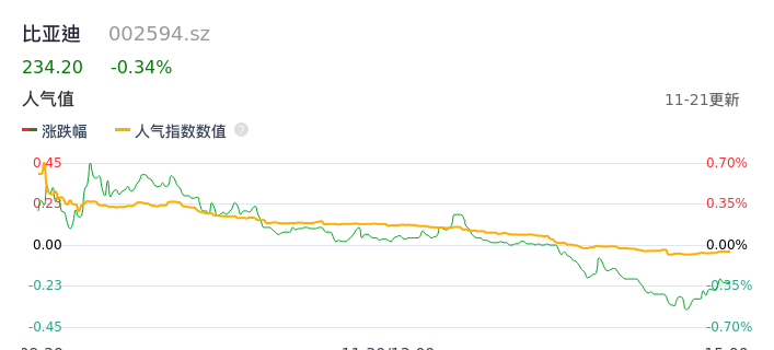 11月21日,比亚迪收报234.20,股价涨幅-0.34%,成交金额19.37亿元,换手率0.71%。