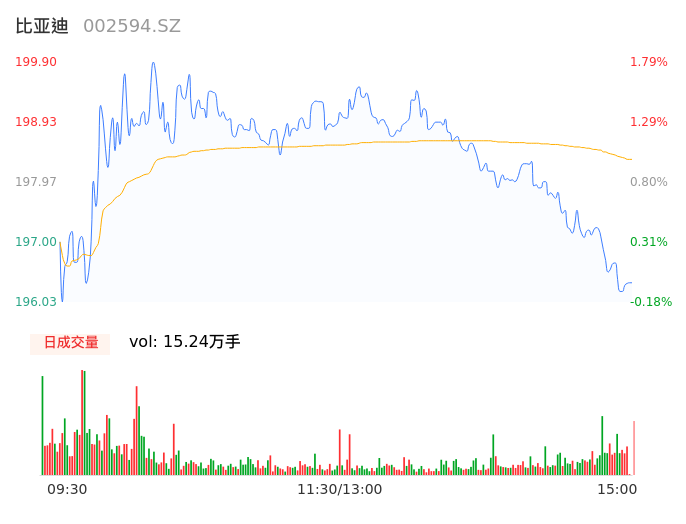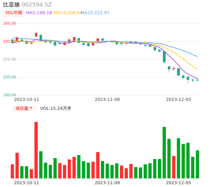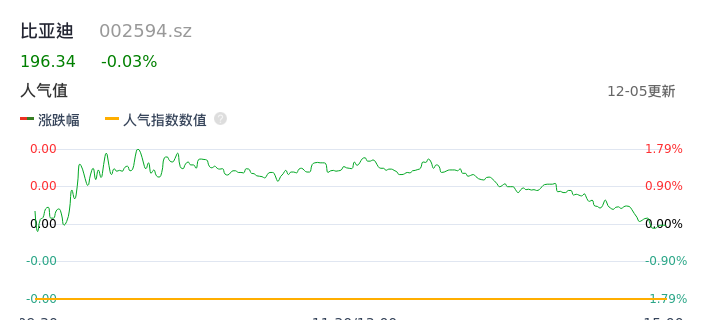 12月05日,比亚迪收报196.34,股价涨幅-0.03%,成交金额30.22亿元,换手率1.31%。