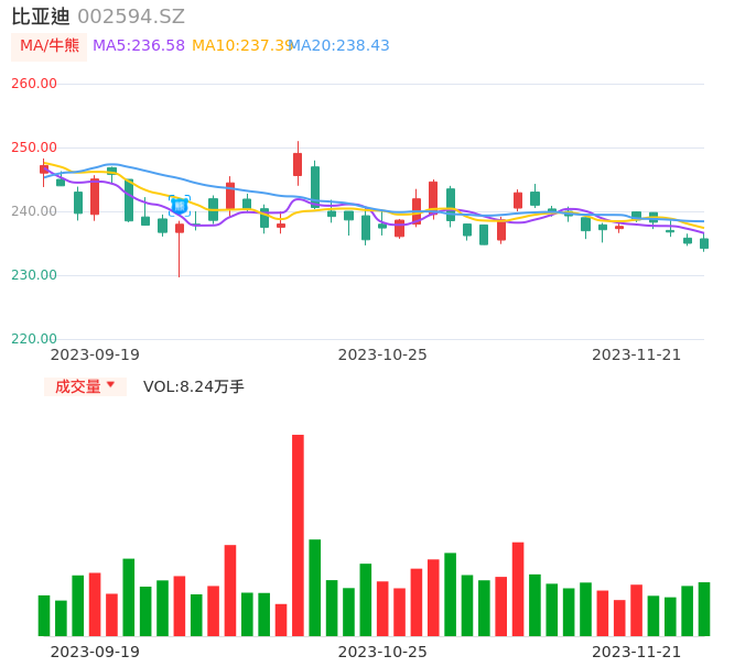 11月21日,比亚迪收报234.20,股价涨幅-0.34%,成交金额19.37亿元,换手率0.71%。