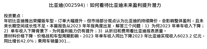 值得注意的是:2024年04月国联证券的高登/陈斯竹分析师,首次发布关于比亚迪的研究报告,标题为:比亚迪(002594):如何看待比亚迪未来盈利提升潜力。