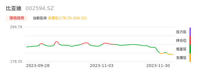 我们来看一下该股的九方特色指标强弱趋势的情况:比亚迪近日从观望区进入支撑区。股价出现一波快速下跌行情,目前下跌动能仍未衰竭。建议继续谨慎观望。注意今日下方支撑位:178.35元,如有效跌破将可能出现新一轮下跌