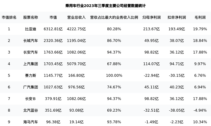比亚迪最新报告期数据为三季度,下表汇总了乘用车行业内市值靠前的公司三季度主要经营数据