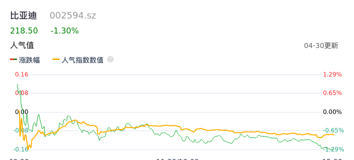 04月30日,比亚迪收报218.50,股价涨幅-1.30%,成交金额25.42亿元,换手率0.99%。