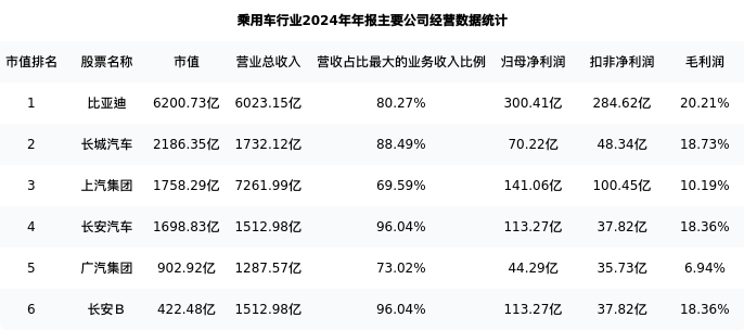 比亚迪最新报告期数据为年报,下表汇总了乘用车行业内市值靠前的公司年报主要经营数据