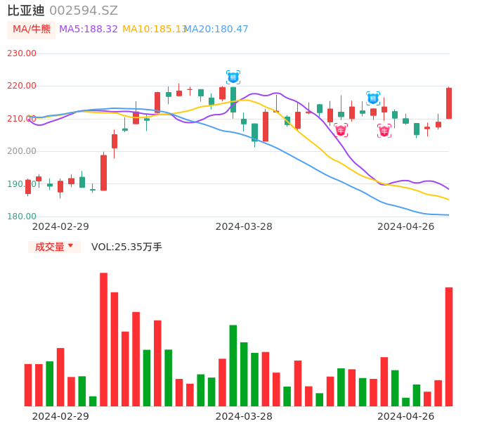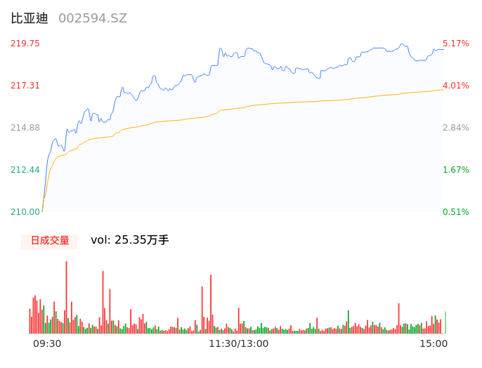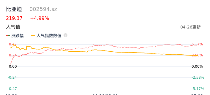 04月26日,比亚迪收报219.37,股价涨幅4.99%,成交金额55.02亿元,换手率2.18%。
