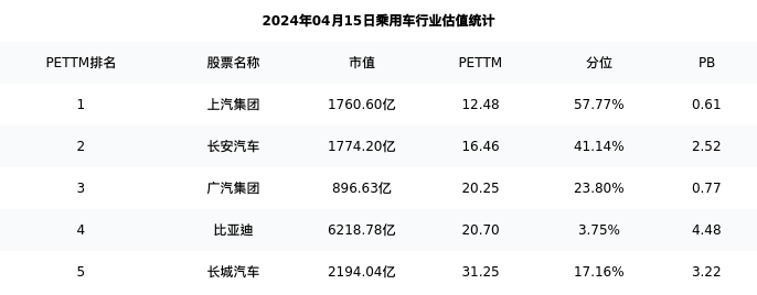 从估值角度看:比亚迪最新市盈率PETTM为20.70,在行业内排名4/8,处于3.75分位。