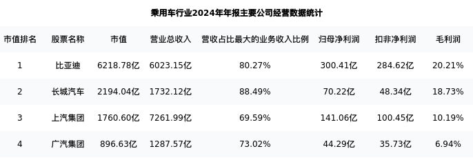 比亚迪最新报告期数据为年报,下表汇总了乘用车行业内市值靠前的公司年报主要经营数据