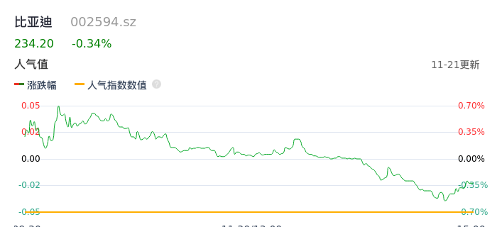 11月21日,比亚迪收报234.20,股价涨幅-0.34%,成交金额19.37亿元,换手率0.71%。