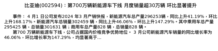 值得注意的是:2024年04月长城证券的分析师,首次发布关于比亚迪的研究报告,标题为:比亚迪(002594):第700万辆新能源车下线 月度销量超30万辆 环比显著提升。