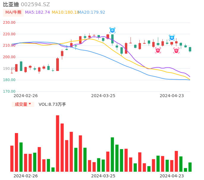 04月23日,比亚迪收报205.04,股价涨幅-1.69%,成交金额17.94亿元,换手率0.75%。