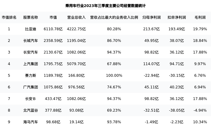 比亚迪最新报告期数据为三季度,下表汇总了乘用车行业内市值靠前的公司三季度主要经营数据