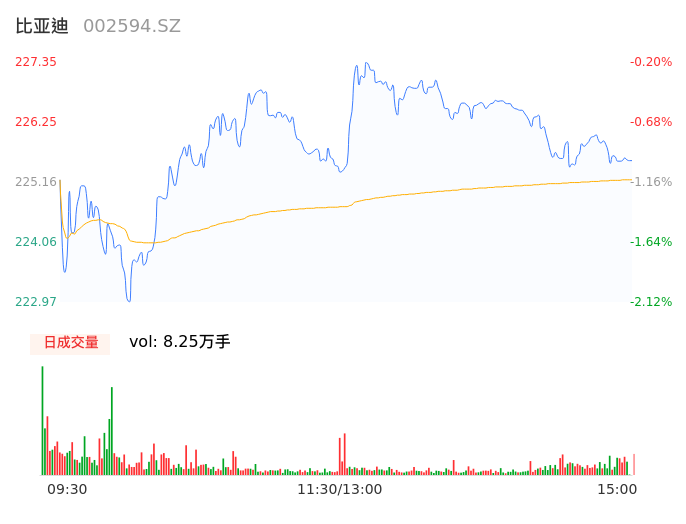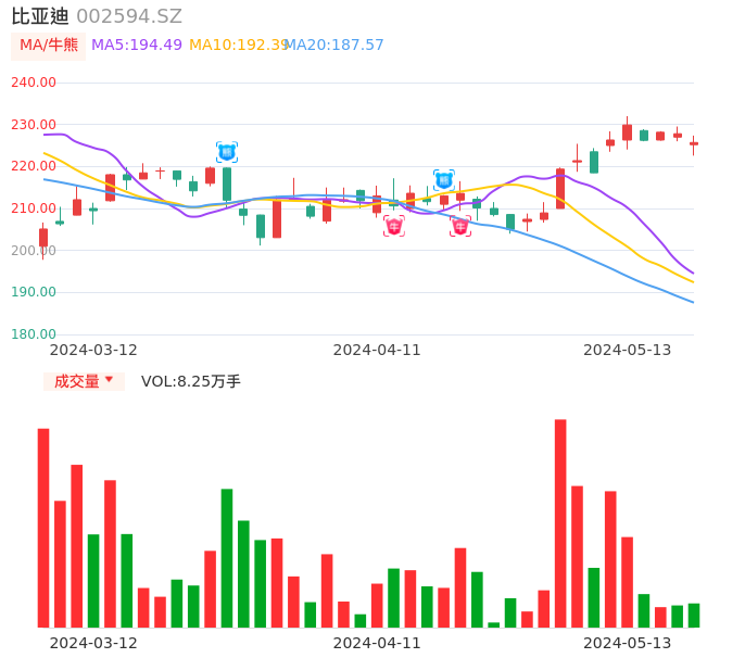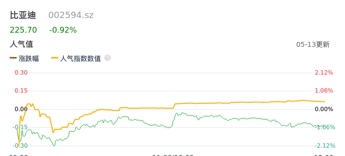 05月13日,比亚迪收报225.70,股价涨幅-0.92%,成交金额18.58亿元,换手率0.71%。
