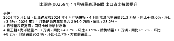 值得注意的是:2024年05月国联证券的高登分析师,首次发布关于比亚迪的研究报告,标题为:比亚迪(002594):4月销量表现亮眼 出口占比持续提升。