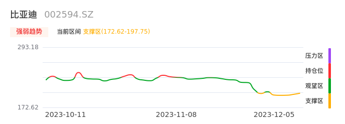 我们来看一下该股的九方特色指标强弱趋势的情况:比亚迪自11月29日进入支撑区。股价出现一波快速下跌行情,目前下跌动能仍未衰竭。建议继续谨慎观望。注意今日下方支撑位:172.62元,如有效跌破将可能出现新一轮下跌。
