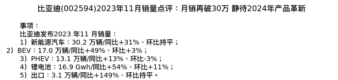 值得注意的是:2023年12月华创证券的张程航/夏凉分析师,首次发布关于比亚迪的研究报告,标题为:比亚迪(002594)2023年11月销量点评:月销再破30万 静待2024年产品革新。