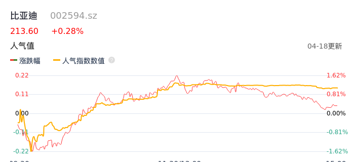 04月18日,比亚迪收报213.60,股价涨幅0.28%,成交金额28.64亿元,换手率1.15%。