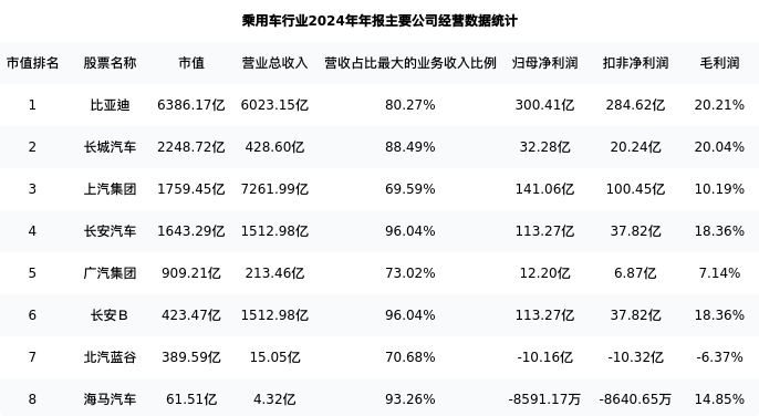 比亚迪最新报告期数据为年报,下表汇总了乘用车行业内市值靠前的公司年报主要经营数据