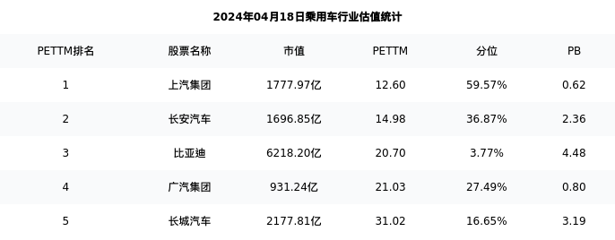 从估值角度看:比亚迪最新市盈率PETTM为20.70,在行业内排名3/8,处于3.77分位。
