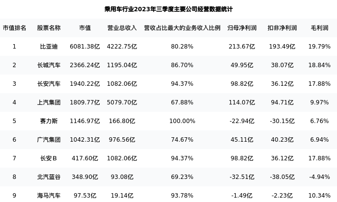比亚迪最新报告期数据为三季度,下表汇总了乘用车行业内市值靠前的公司三季度主要经营数据
