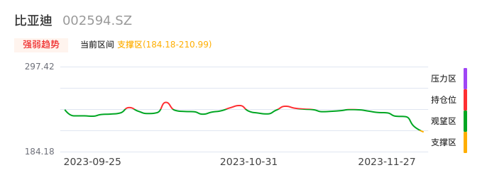 我们来看一下该股的九方特色指标强弱趋势的情况:比亚迪近日从观望区进入支撑区。股价出现一波快速下跌行情,目前下跌动能仍未衰竭。建议继续谨慎观望。注意今日下方支撑位:184.18元,如有效跌破将可能出现新一轮下跌