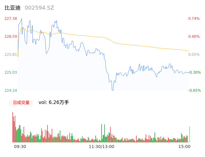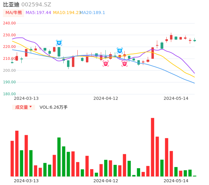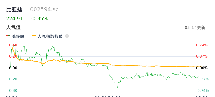 05月14日,比亚迪收报224.91,股价涨幅-0.35%,成交金额14.15亿元,换手率0.54%。