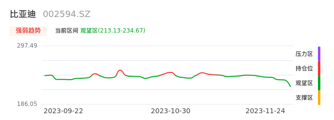 我们来看一下该股的九方特色指标强弱趋势的情况:比亚迪自11月08日从持仓区下穿到观望区,股价近期持续走弱。短期已经进入空头行情,且下跌动能仍未衰竭。建议继续谨慎观望。