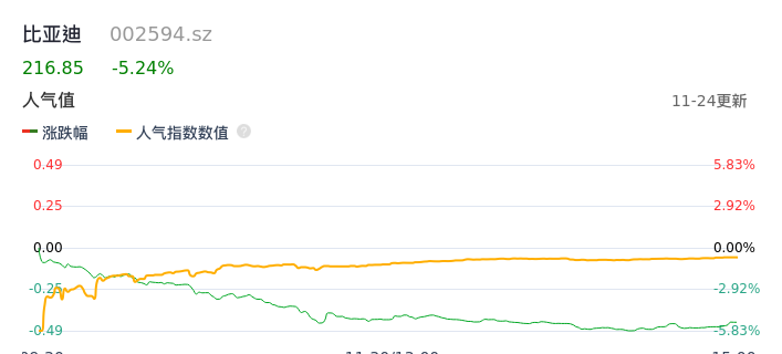 11月24日,比亚迪收报216.85,股价涨幅-5.24%,成交金额61.63亿元,换手率2.41%。
