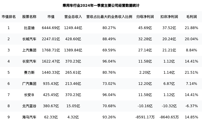 比亚迪最新报告期数据为一季度,下表汇总了乘用车行业内市值靠前的公司一季度主要经营数据
