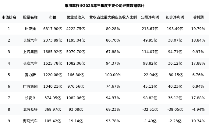 比亚迪最新报告期数据为三季度,下表汇总了乘用车行业内市值靠前的公司三季度主要经营数据