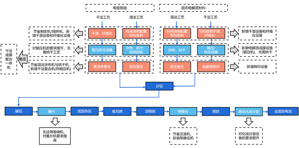 全固态电池的前道制造关键在于电极片制造环节。可以采用湿法/干法工艺。