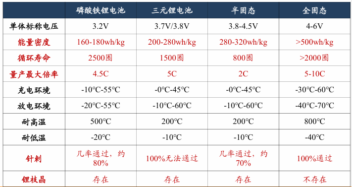 固态电池具备高能量密度、高安全性、不存在低温衰减问题。(1)高能量密度:传统液态锂电池能量密度小于300Wh/kg,而固态电池的能量密度能达到300-500Wh/kg。(2)高安全性:传统液态电池的电解液使用可燃性有机溶剂,在受到外力或封装不善时容易发生漏液现象,而固态电解质不存在液体泄漏的问题,在针刺、挤压测试中不易短路或起火,抗物理损伤性能优于液态电池;另外,液态电解液在150-200℃即可分解,甚至有自燃和爆炸风险,而固态电池热失控温度通常在200-600℃,电池安全性得到有效提升。(3)解决低温衰减问题:全固态电池由于采用全固态电解质,不会出现电解液在低温环境下充放电效率衰减问题。