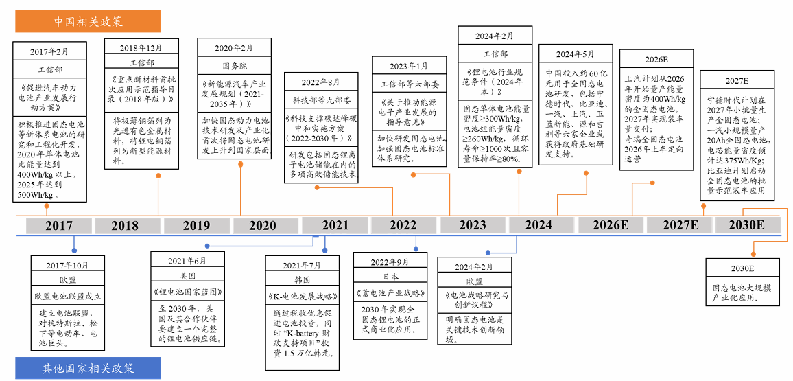 海外企业也基本锚定2027年为第一代硫化物电池的目标节点。第一阶段,2024-2027年,将推出采用传统NCM正极和石墨/硅负极的第一代硫化物固态电池,电池能量密度达到300-400Wh/kg。第二代硫化物固态电池将在2030年左右实现商业化,同时应用新一代正极(如富锂和高压正极)、负极(如高硅负极、锂金属负极和无负极设计)和超薄SE膜,以及双极板等新型电池设计,能量密度将超过450Wh/kg和1000Wh/L。国内液态电池技术显著领先海外,海外加速布局固态电池,试图弯道超车,2023-2024年频繁宣传全固态小批量产计划;我国政策层面积极推进固态电池产业化。