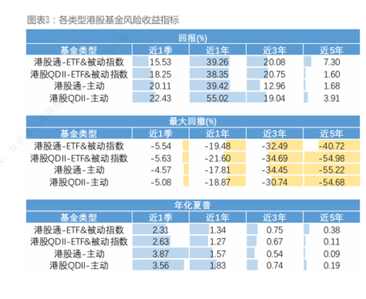 三季度各类港股基金平均回报均为正。其中,“港股QDII-主动”和“港股通-主动”两类产品表现领先,平均回报分别为22.43%和20.11%,主要受益于当季涨幅突出的创新药主题基金多为主动管理型。而“港股通-ETF&被动指数”类基金因配置较多弹性较弱的高股息和金融类ETF,整体表现相对落后。