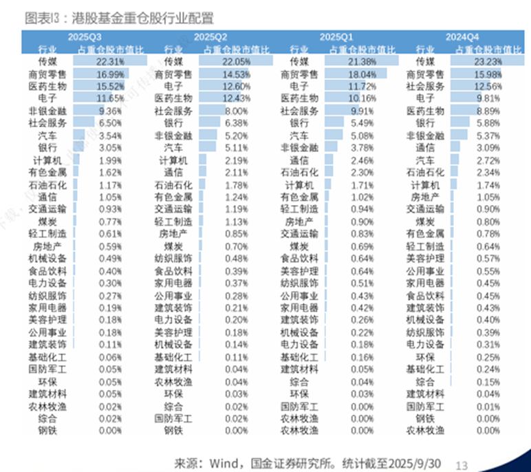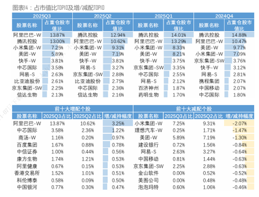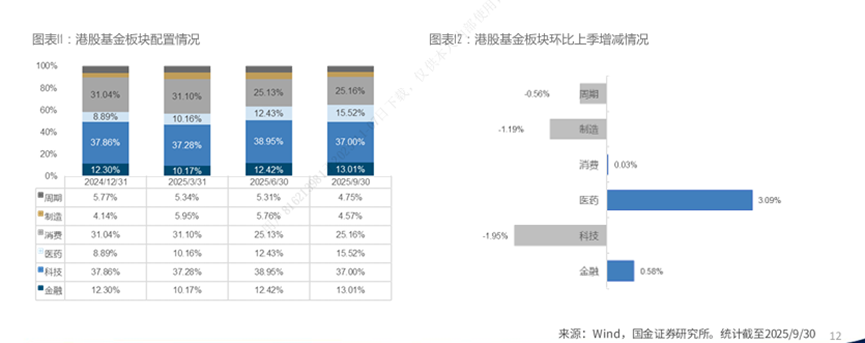 从板块配置来看,科技(37%)和消费(25%)仍为前两大重仓板块。医药板块获明显增持(增加3个百分点),科技板块则出现减持(减少2个百分点),部分原因在于三季度热门的算力概念在港股中标的相对有限,部分资金转而投向弹性更高的创新药板块。