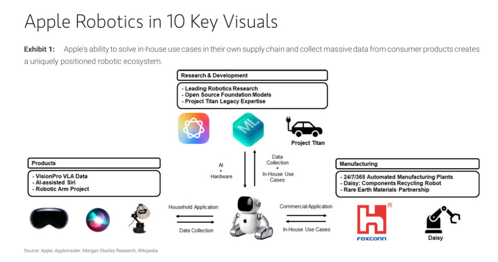 特别是在视觉数据方面,Apple Vision Pro和近期发布的EgoDex数据集(迄今为止规模最大的灵巧操作第一视角视频数据集)凸显了苹果在训练机器人模型方面的独特优势。报告还指出,苹果在供应链管理和大规模自动化生产方面积累的经验,例如其回收机器人Daisy和合作伙伴富士康,为其未来机器人的量产奠定了基础。此外,即使是已终止的“Project Titan”自动驾驶汽车项目,其在计算机视觉和机器学习方面的研发遗产,也为苹果的机器人事业提供了宝贵的技术积累。