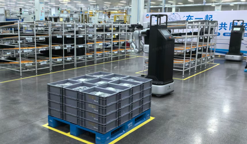 此次合作的突破性创新,通过"具身机器人+AMR"构建了深度协同系统,其中具身机器人A2-W负责多层料架周转箱取放,AMR负责车间内重载整托物料运输。依托生产系统的智能派单与动态叫料机制,AMR将物料从拣选室配送至线边上料点,具身机器人A2-W可自动识别箱体、自主调整姿态,完成拆垛上料及空箱回收,实现从物料出库、产线上料、空箱回收流转的全流程作业。该系统既发挥了具身机器人对周转箱的泛化作业能力以及复杂场景的自适应能力,也充分利用AMR在长距离、高负载运输中的效率优势,解决了传统自动化设备在多车间、多品类场景下的柔性适配痛点,为制造业周转箱拆码垛、搬运、上下料等场景提供了可直接复用的协同方案。